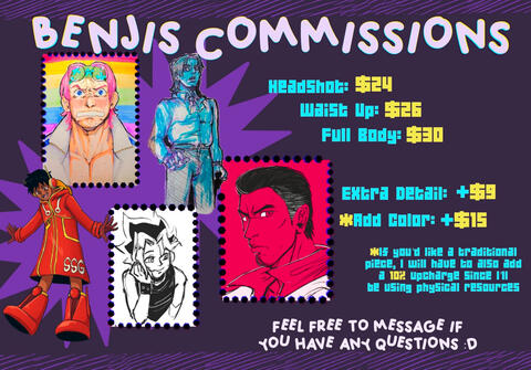 Please contact me before sending any payment. I'll do either traditional or digital, up to you. unless you tell me not to, i will post a watermarked version of the commission on my socials